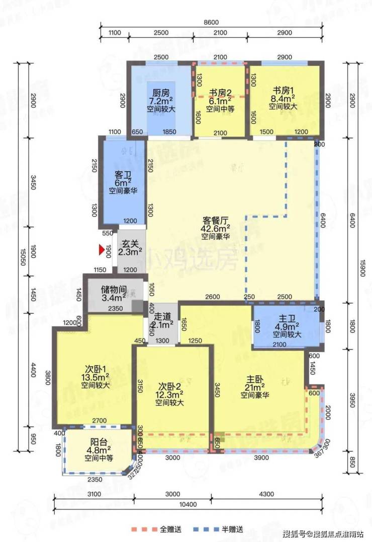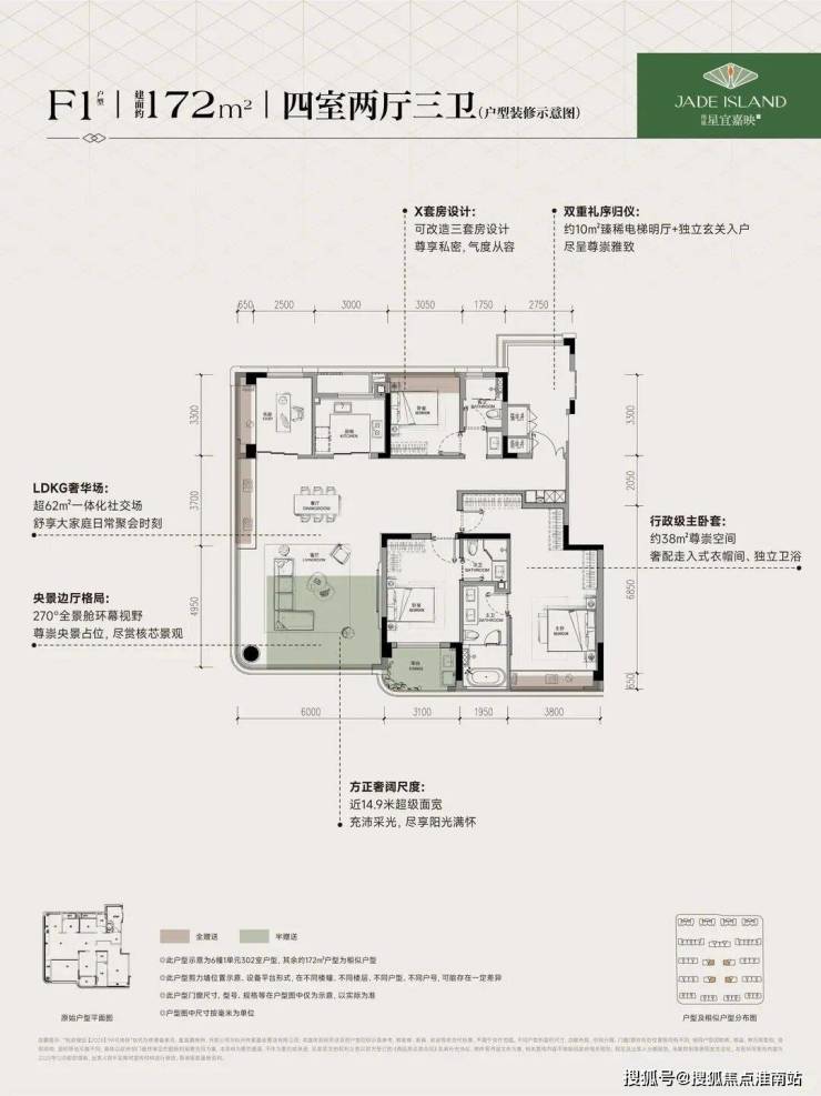 ❶建面约172㎡F1户型,4房2厅3卫,含赠送得房率约96%。