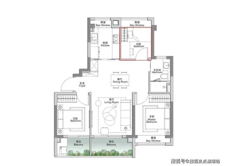 这个户型除了三开间朝南,再加上“3个飘窗+双面阳台系统”,采光通透性非常高优势之外,业主还可根据家庭结构与生活需求,灵活将空间定制为3房或者2+1房。