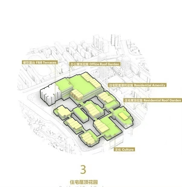 归家动线:建立在混合业态的基础上,住宅用户归家,可以通过专属独立大堂的艺术阶梯或者周边电梯,垂直抵达三层/四层归家花园道,实现情绪归家。在花园内可以通过风雨连廊实现无风雨归家。