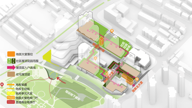 步行体验 为每个人规划不同动线 ;中興傲舍项目,基于人的关系的角度去设计动线,在高混的业态中,为住宅用户创造私密性和独立性,如到达高线公园这一层都有门禁,只有住户能够抵达,从而将简单的道路线条演变为丰富的空间内容:出与入的记忆、城市与社区的联系、公区与私域的桥梁。