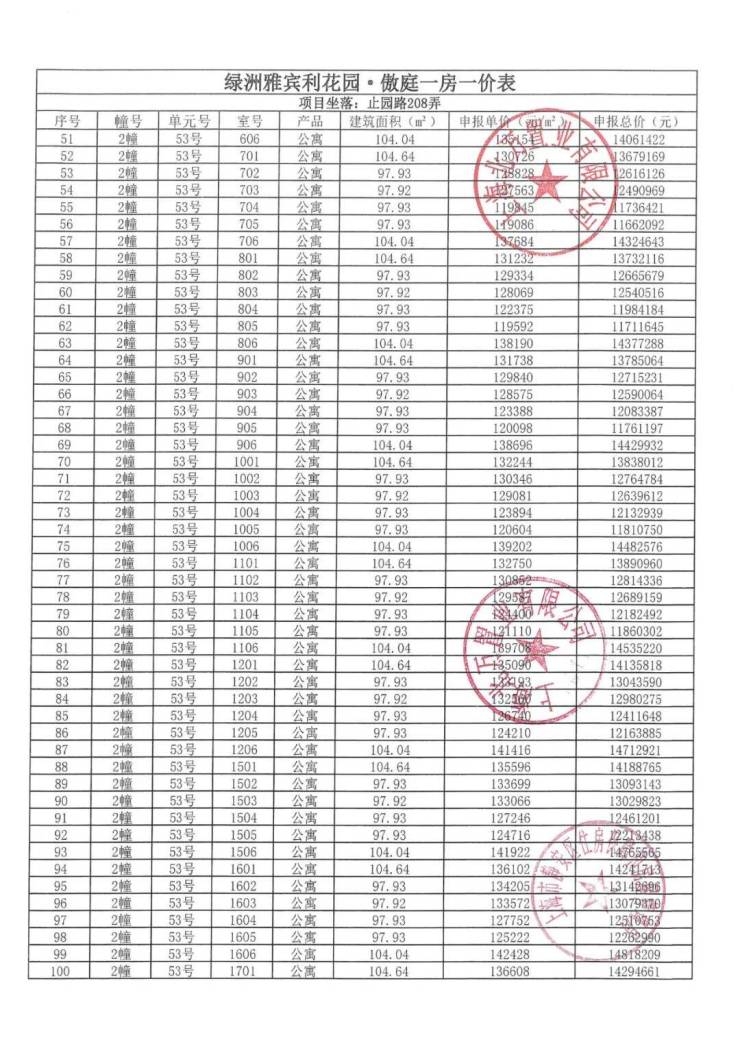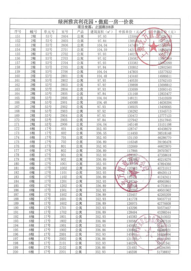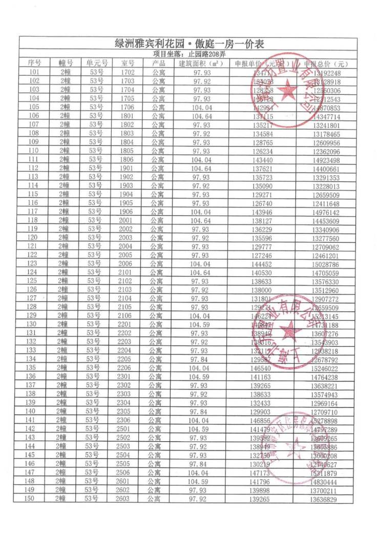 上期一房一价表如下