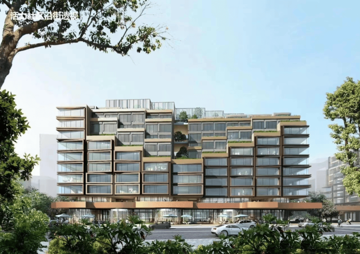 外立面方面,项目整体将打造为新海派建筑地标,设计有弧线阳台、45度玻璃、双层塔冠等,设计灵感来源于蔓楼兰;立面色调方面,将采用珐琅彩色调,具体或为珍珠蓝铝板+红色纹理+金色线条,具体材料及配色还在最终确认。