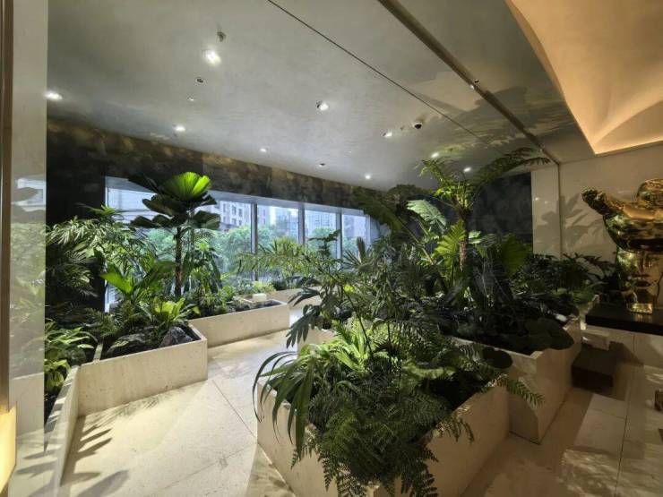 豪宅中,会所+泳池已经成为市场标配。但是万科中興傲舍,真正做到了 “把艺术作为生活的一部分” 。植物园泳池放在了2楼,选用了皮革面的绿色石材,营造一种树影斑驳的感觉。里面的绿植不是装饰,都是鲜活的、精心照养的。