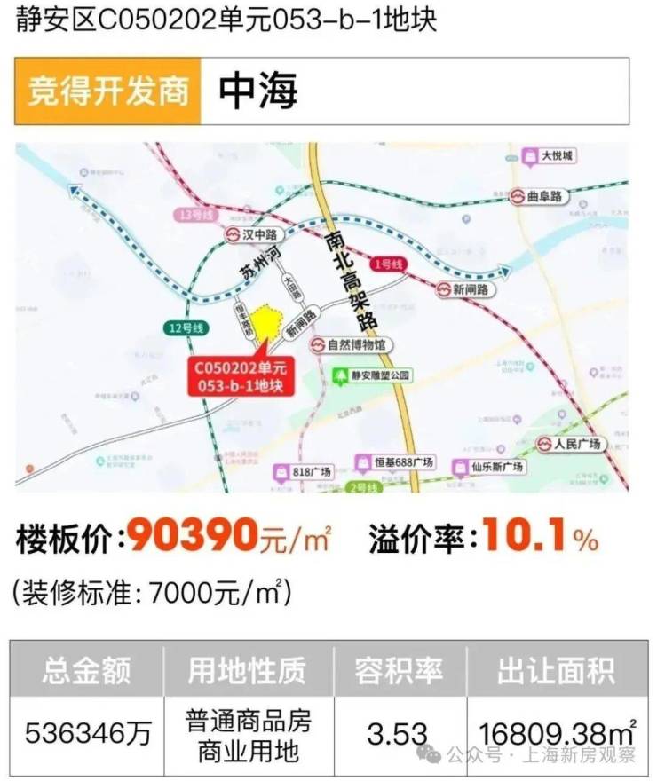 日前,新鲜出炉的去年第5次土拍结果,也应证了这个现状,优质项目竞争激烈,价格不断攀升,尤其是同属静安区的曹家渡地块(静安区曹家渡社区C050301单元9A-20地块),溢价31.2%,楼板价就达到11.41万元/㎡!