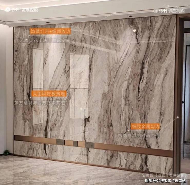 全墙纸交标结合整幅岩板客厅景墙,以定制设计感提升空间立体感。