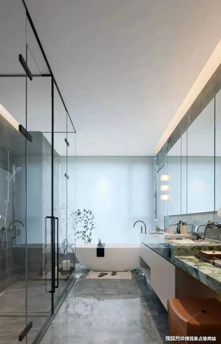 穿过一小段走廊,到主人的休憩区,先是舒怡的衣帽间,朦胧柜饰面,让休整充满优雅从容。卫生间以星雅灰大理石覆面,独立浴缸旁则用冷翡翠奢石点缀,一侧更设有整面玻璃,通透明亮。若沐浴间小酌,望见城市界面,于雅居,见繁华。