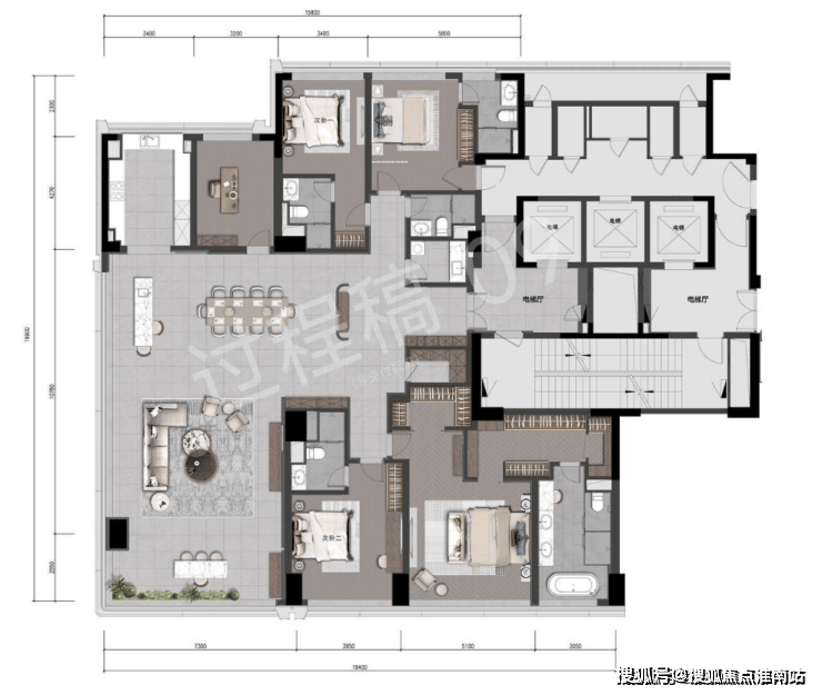 公区方厅第一眼的感觉就是辽阔,建筑面积超90㎡,想举办超大型party都没问题,并且南向开间有约19米,这样的尺度能和市面上四五百方户型的客厅媲美了。