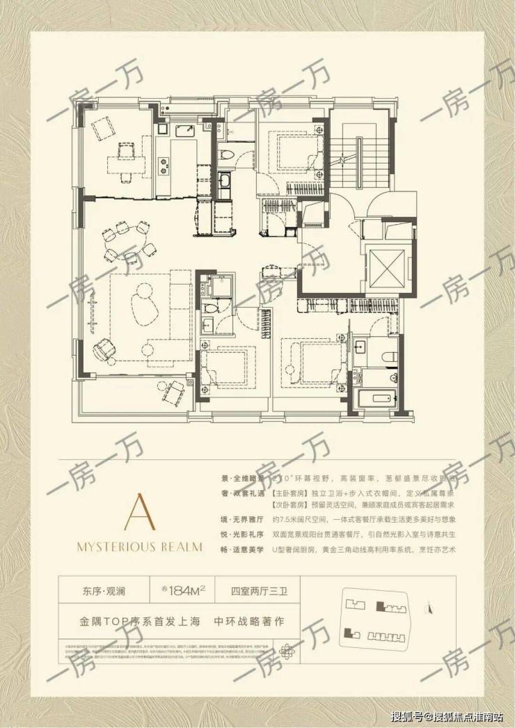 约184㎡样板间,四房两厅三卫格局,LDKB一体化设计,客餐尺度达7.5米面宽,270°极致环幕窗景,最大化引景入室,百万方森态谧境成为私享级流动窗景。