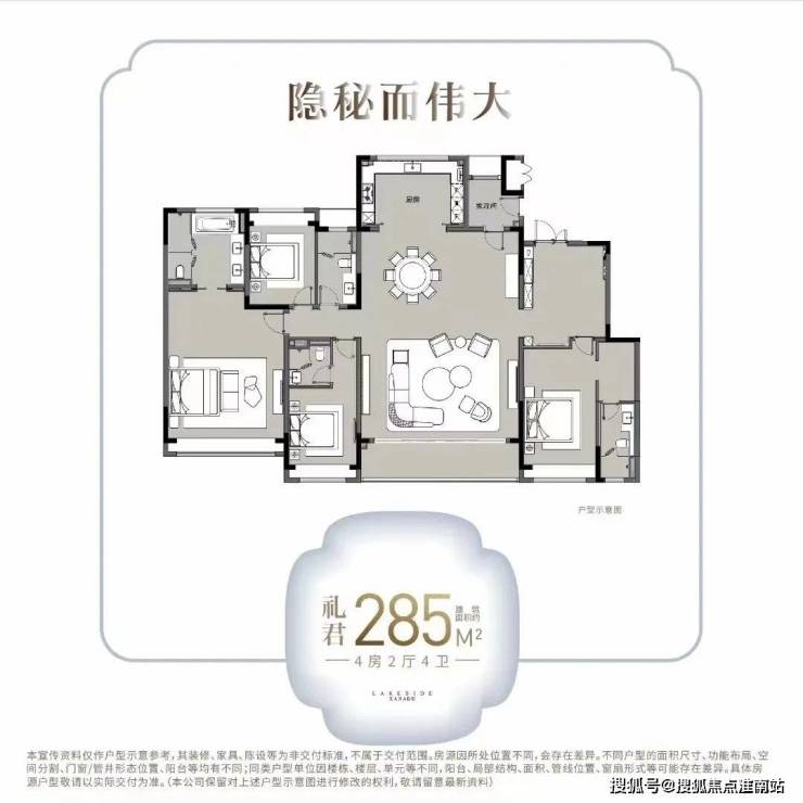 主力户型:有建面约 285㎡、300㎡、340㎡的大平层产品,户型为 4 房 4 卫或 5 房 4 卫设计。