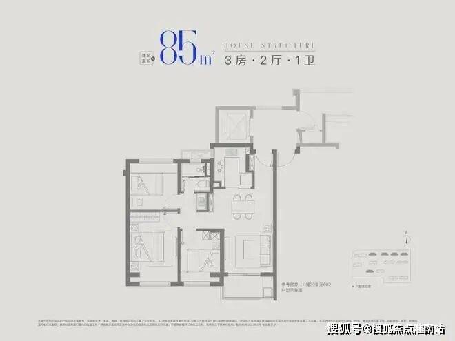 建面约85㎡3房1卫,做到三开间朝南+全卧室带飘窗+卫生间干湿分离+动静分离,非常紧凑的小3房。
