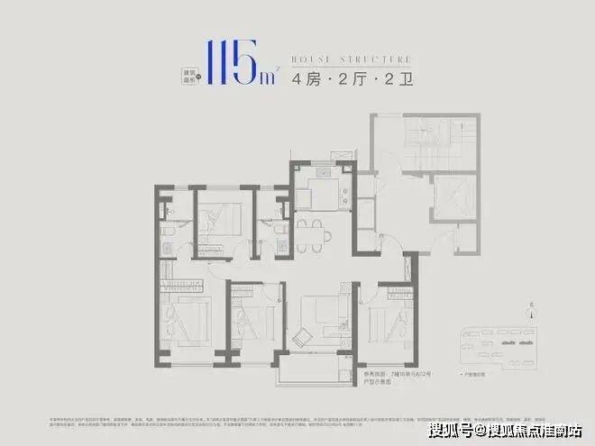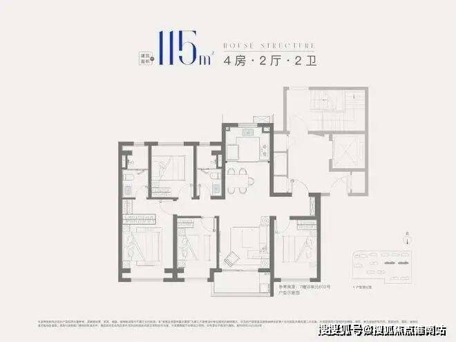 建面约115㎡4房2厅2卫,做到了四开间朝南+全卧室带飘窗+主卧套房设计,一步到位的大四房户型。兼顾大4房的功能性和空间尺度,非常难得,更适合四口之家或三代同堂家庭居住。
