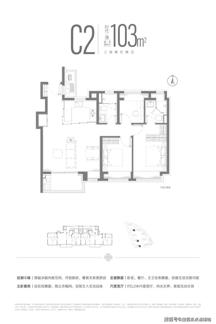 建面约103m²三房两厅两卫户型,南北双卧L型270°揽境飘窗设计,更大限度地让自然融入与自在之中,更宽阔的空间尺度,让自在生长与自然之中。