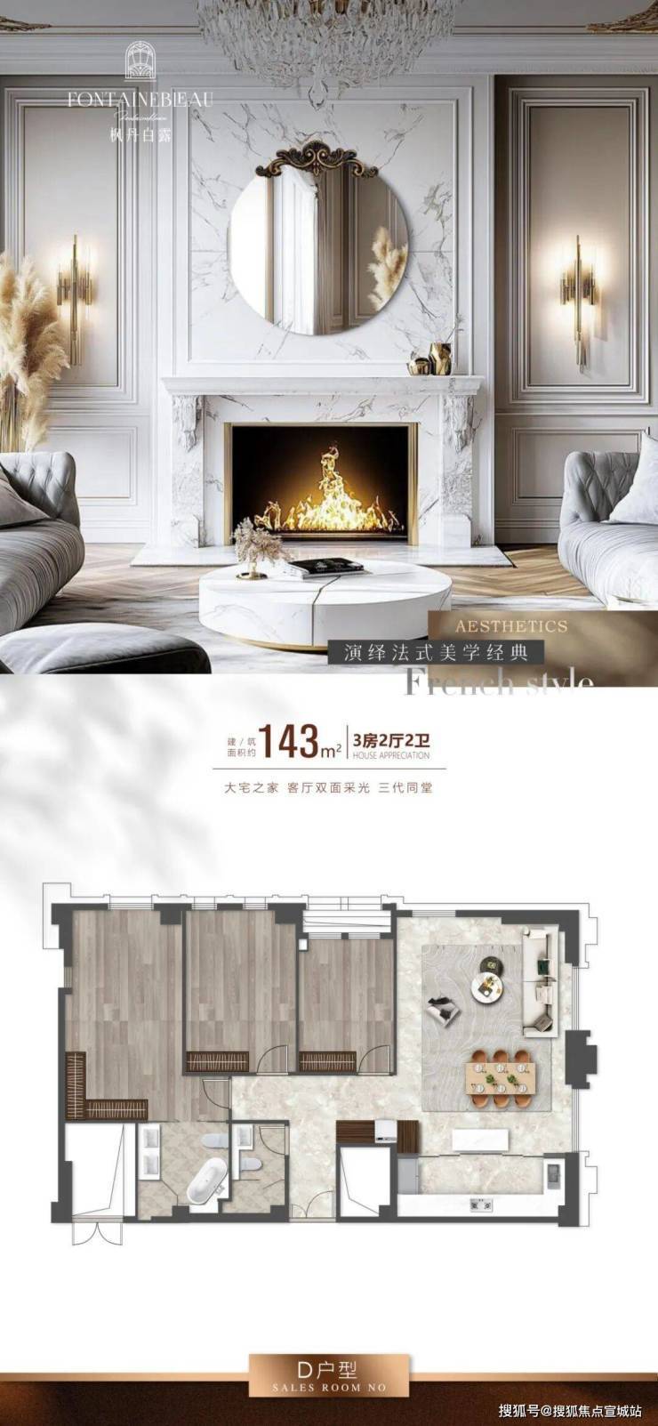 143平方户型,三房两厅两卫户型,。整体装修风格法式现代风,交付标准精装全配(视频在结尾)