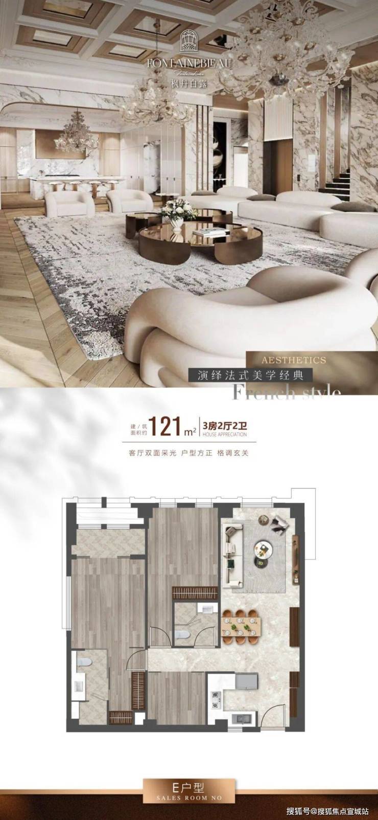 面积121平方,两房两厅两卫户型,整体装修风格法式轻奢风格,交付标准精装全配(视频在结尾)