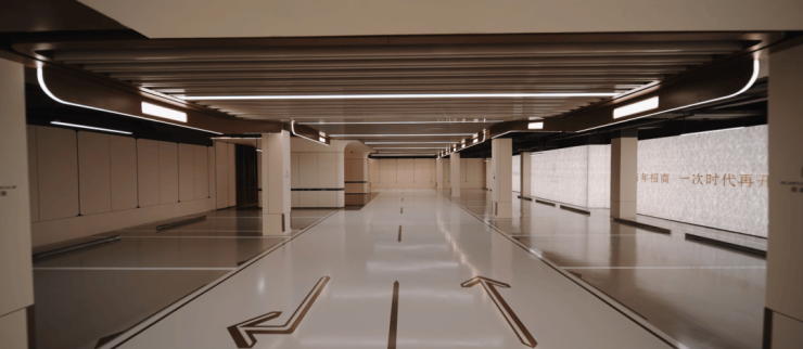 过去在豪宅项目才能看到的类似于“星空顶”地下车库坡道,招商臻境使用了看来更加高级的香槟金色吊顶,并加上穹顶闪耀的“追光”坡道!
