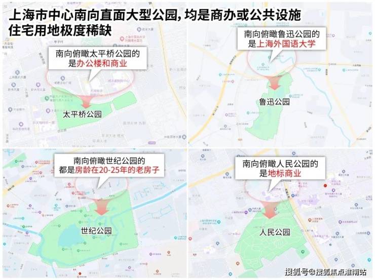 具体到上海,你会发现市区南向俯瞰大型优质公园的房子,有也只是20年以前的老房子。