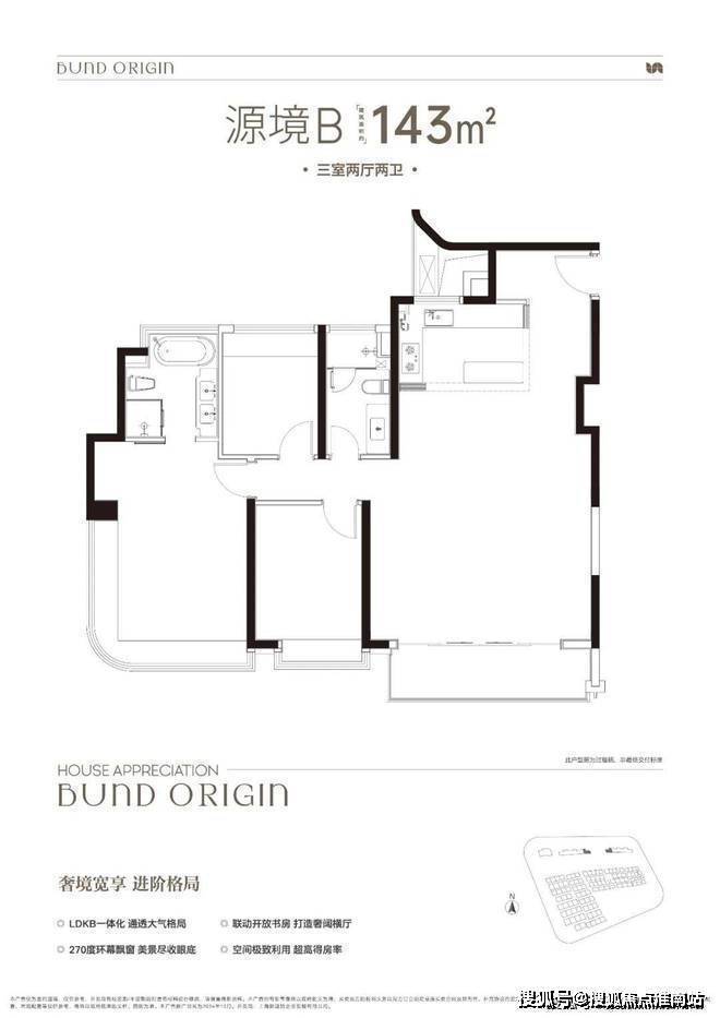 B户型是3房2厅2卫格局,三开间朝南+LDKB一体化+奢阔宽厅+全卧室带飘窗+主卧套房设计+动静分离+主卧270度飘窗,舒适度更高。