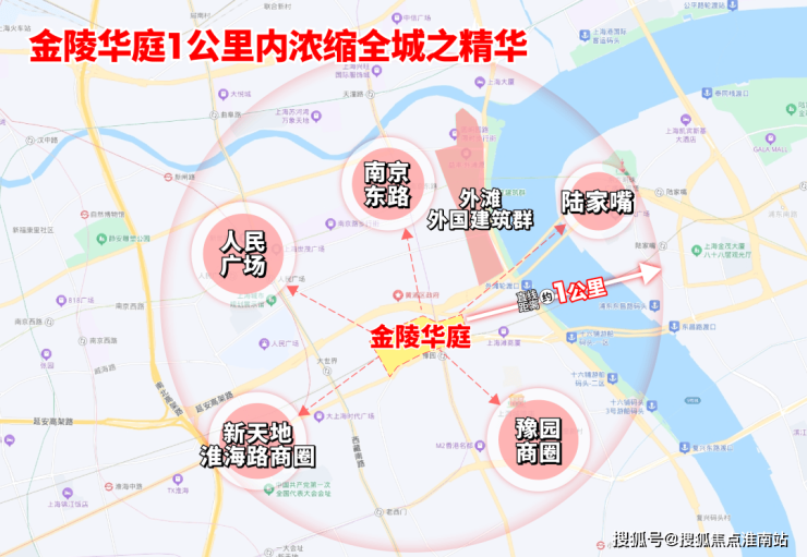 作为上海绝对市心,金陵华庭1公里生活圈囊括人民广场、淮海路、新天地、外滩、豫园、陆家嘴等上海市地标性区域。