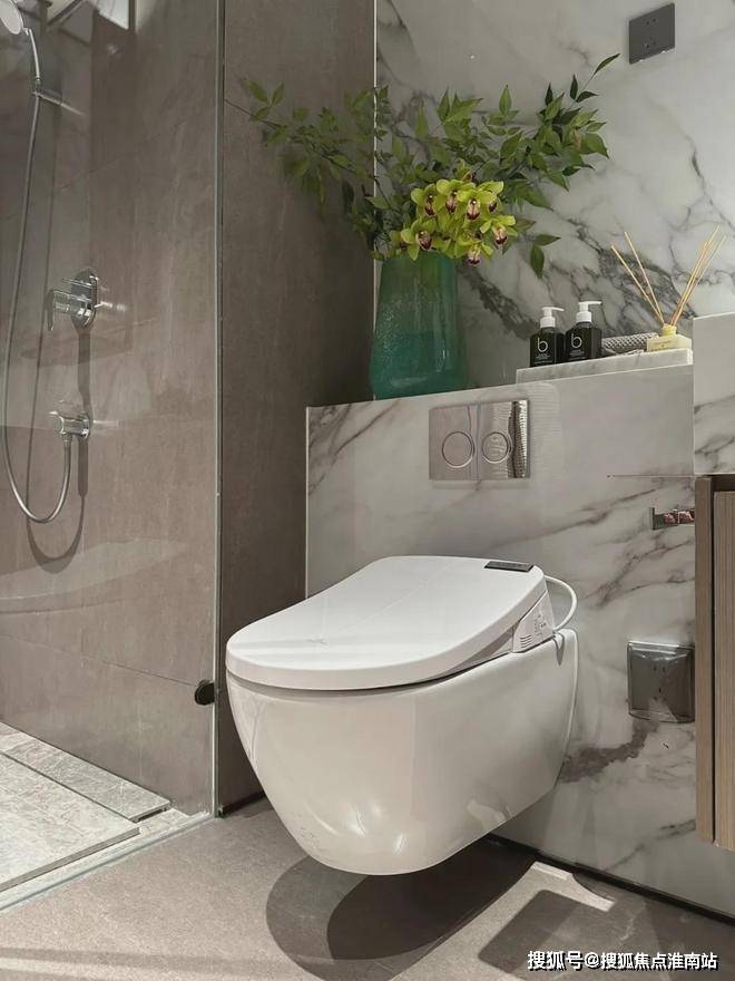 这还不是重点,玄关座椅背后,是一面皮革包裹的墙面。鞋柜的饰面,纹路方向统一,呈现出极强的协调感。下方的橱柜则做了转角拉篮,充分利用转角空间,使物品井然有序的同时,轻松方便取放。水槽也是一个大单槽,放得下炒锅汤锅这种大物件~抽拉式龙头,清洗大水槽的时候很方便,360度旋转伸展自如,这款弯管还是硅胶材质,柔软耐用有弹性,还可切换出水模式,出来的水柱也是很柔和细腻不飞溅。厨房玻璃门是上轨道移门,意味着地面部分没有任何轨道,不会有灰尘积攒,炒菜时关上,避免油烟散入室内;平时拉开,可以扩充室内视觉感受。卫浴缦云上海所有户型的所有卫生间里都用了悬浮式的洁具和柜体,确保了下方空间的打扫无死角,对未来的入住带来非常大的便利性!你们可以看下缦云上海是如何处理卫生间木门的防潮的——卫生间一侧用大理石做踢脚线,这是真正细致入微的巧思!层高对于缦云上海的纯大宅社区定位,能买这样产品的购房者会非常在意空间感。缦云上海全部户型层高约3.3米,室内所有空间的门都做了通顶设计,更阔绰的居室空间,将生活格局有效放大,通风、采光和观景体验的全方位提升!而且,门套做了弧形设计后,还叠加了金属线与墙纸做了分割,加强隔断界限感,提升室内家居精致度~比起中规中矩的直线,弧形施工工艺更复杂、造价更高,却多了几分灵动轻盈!这种弧形的元素不只是在样板间里,在售楼处也能经常看到,比如电梯厅。
