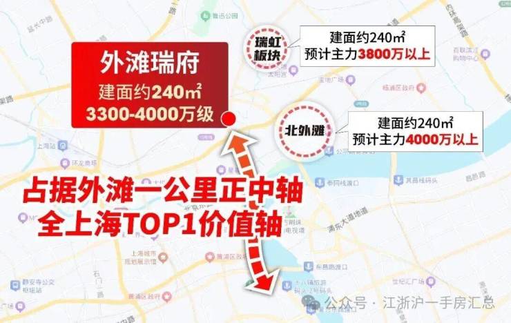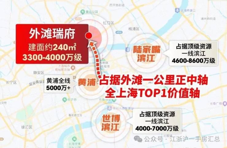 而外滩瑞府不仅占位外滩一公里正中轴,地段更靠上游、能级更胜一筹,总价却牢牢控制在3300-4000万级。无论单价还是总价,相较下游板块都更具优势,安全垫更为扎实。
