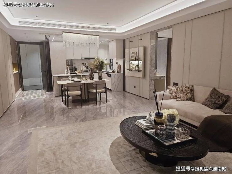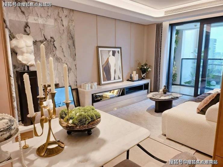 电视背景墙采用卡慕白的石材+皮革造型,弧形吊顶,相当讲究,连空调出风口的形状都打造为海上·清和玺logo山茶花的形状~~三大件为大金(或同等档次)中央空调和地暖,新风系统为百朗(或同等档次),南向阔景阳台,采光视野一级棒!