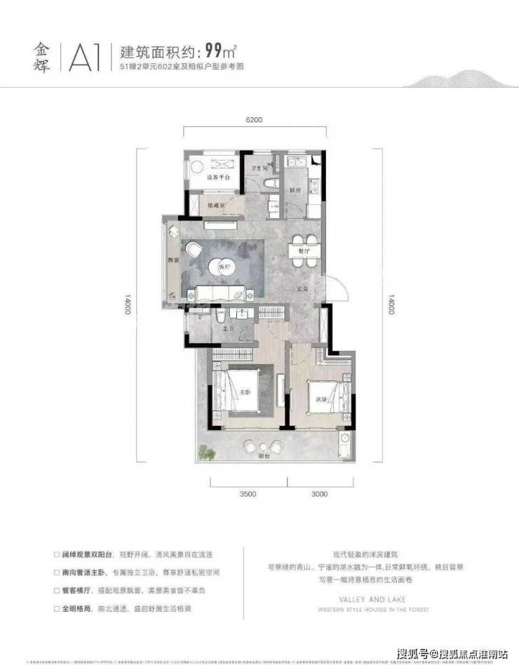 户型点评优势:双阳台设计,完美匹配湖山美景。客餐厨动线合理,观景飘窗连通了室内室外两重空间。南北通透、分区合理,尤其是储藏室的设计,十分贴心。99㎡的大两居,恰到好处地放大了各个功能区,整体看过去十分舒畅。