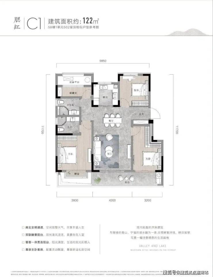 户型点评优势:122㎡的三房两厅两卫设计,留出了独立的玄关收纳空间与落尘区,十分贴心。三个房间分布在三个方向,空间都不显局促,主卧更是自成一体。客厅连阳台,一动一静之间景观尽收眼底。