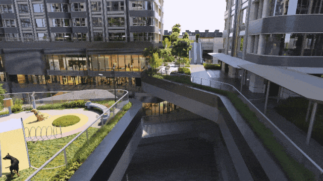理想之地则为城市构建起“片区级共生系统”.其以6座桥及空中连廊打造『连续慢行系统』,天桥将地块与嘉定新城轨交站点连接,同时地块内设置借鉴高线公园的能量环天桥设计,联通围绕超级十字路口的四个地块,形成以能量环为核心的空中步行体系,增加社区的活力.