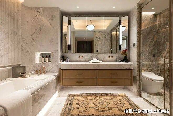 ✅万科中兴傲舍营销中心热线4008875663(官方预约看房热线)正对玄关的位置是主卫,地面墙面为巴西鱼肚灰,淋浴间为水云纱。五金品牌为GESSI,浴缸及智能马桶品牌为劳芬,定制镜柜里面配有美妆冰箱。