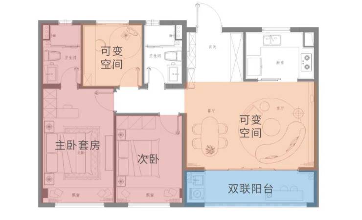 南向两开间做成了餐客大横厅,面宽约5.6米,面积超21㎡。同时外接双开间南向阳台,南向横厅采光无疑会比边厅更好。