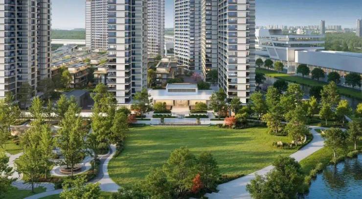 高层住宅沿地块西、北、东三侧分布,靠近崧泽大道,多层及低层住宅则位于地块中心区域,形成错落有致的天际线。