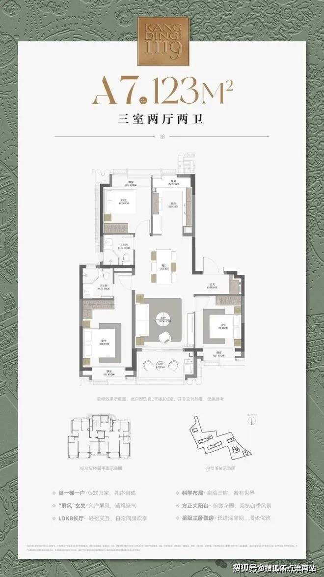 建面约123㎡三房户型,飞机式布局,一镜到底的LDKB长厅,尽显隐贵静安风范;