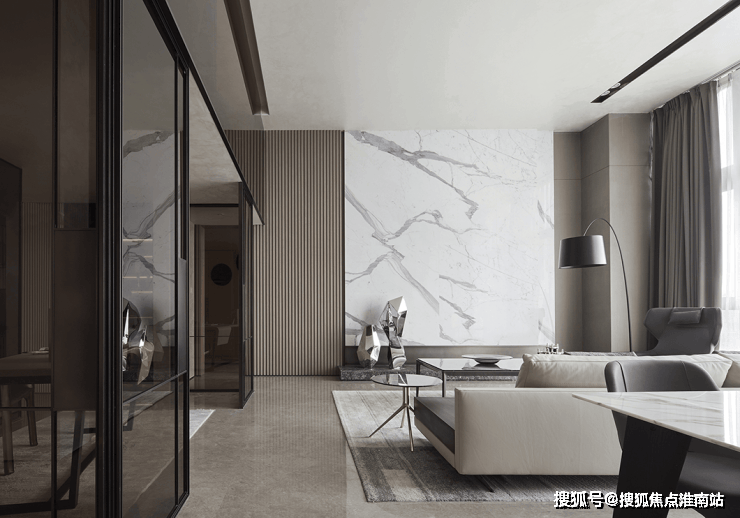 占据整体居所视觉中要的,是以鱼肚白大理石构成的客厅背景墙,线条明晰,行云流水,宛若破晓山涧,都市中突显的自然气息。