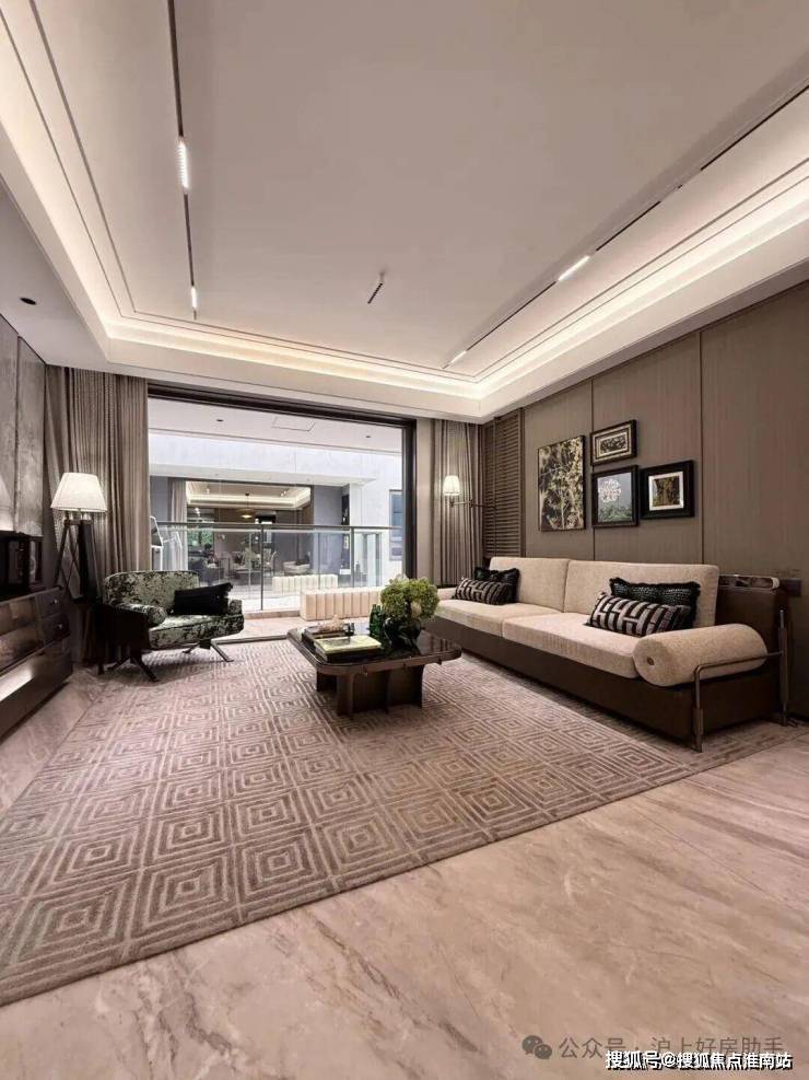 客厅:健康系统,极致工艺(圆弧形吊顶搭配无主灯设计、定制地砖减少拼缝)