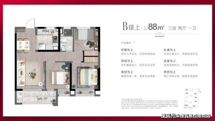 建面约88㎡3房2厅1卫户型, 做到了 三开间朝南+双朝南卧室带飘窗+动静分离 ,采光面拉到极致的小3房。