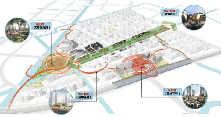 作为城市发展商角色的中交城投,正在为华新未来的发展谋划一盘“大棋”,打造以示范线-徐乐北路站TOD为主导,通过以历史文脉、科创体验及绿色生态为核心的复合站前体验区;打造科创TOD街区,融合了东方水镇,生态与文化的交融,形成“街、桥、寺”的水镇空间。