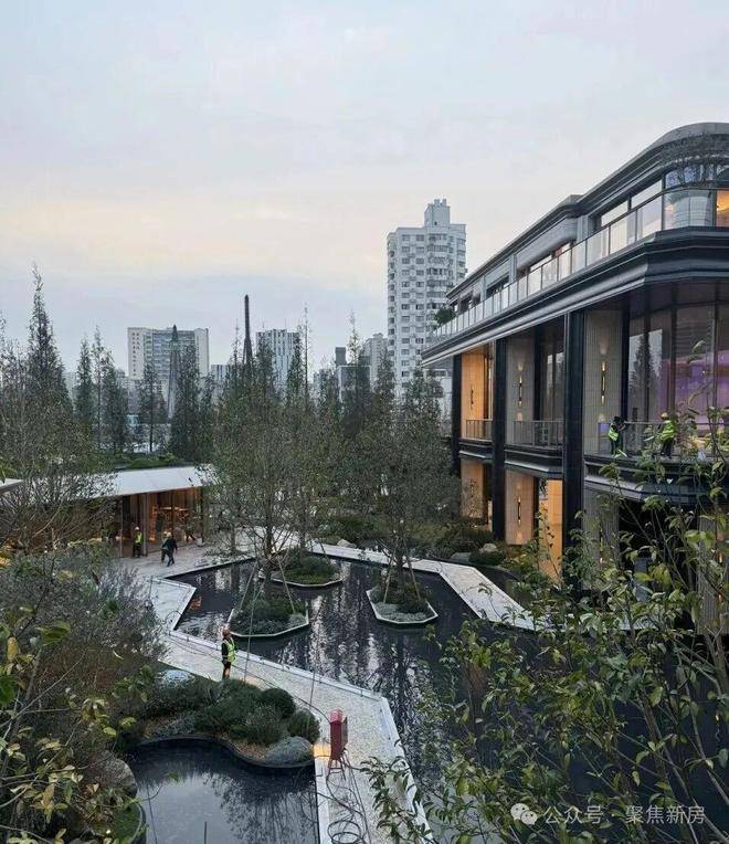三层归家动线:从地面景观层到架空层,再到入户层,穿越绿植、光影与水景,步步进入私域。