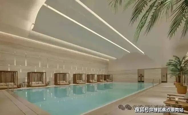 会所内的泳池上方做流畅且立体的吊顶线条,造型现代且富有层次感.这样的设计不仅提升了空间的视觉效果,更营造出一种轻松、悠闲的度假氛围.