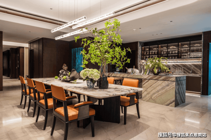 西厨吧台更是匹配了符合空间调性的东方木纹与龙飞凤舞石材,独特的纹理和质感提升了厨房品质与艺术性。