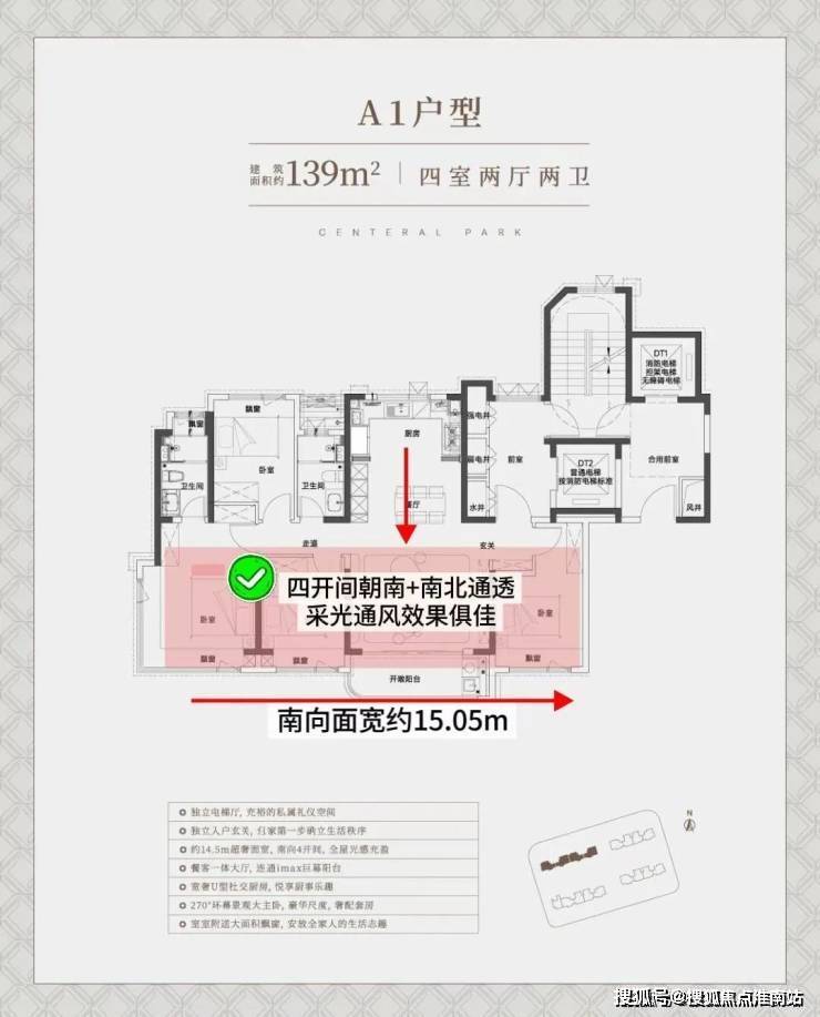 中环铂樾建面约139㎡的户型(西边套),独立电梯厅+罕见的大横厅设计,大面宽短进深,约15.05m的南向奢阔面宽,无论是采光感、尺度性都拉到了极致,享受城央豪宅级别的采光。