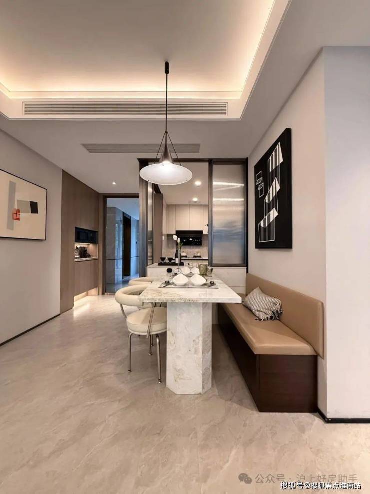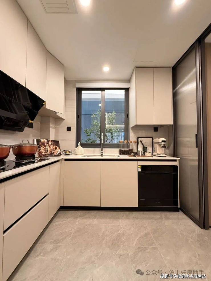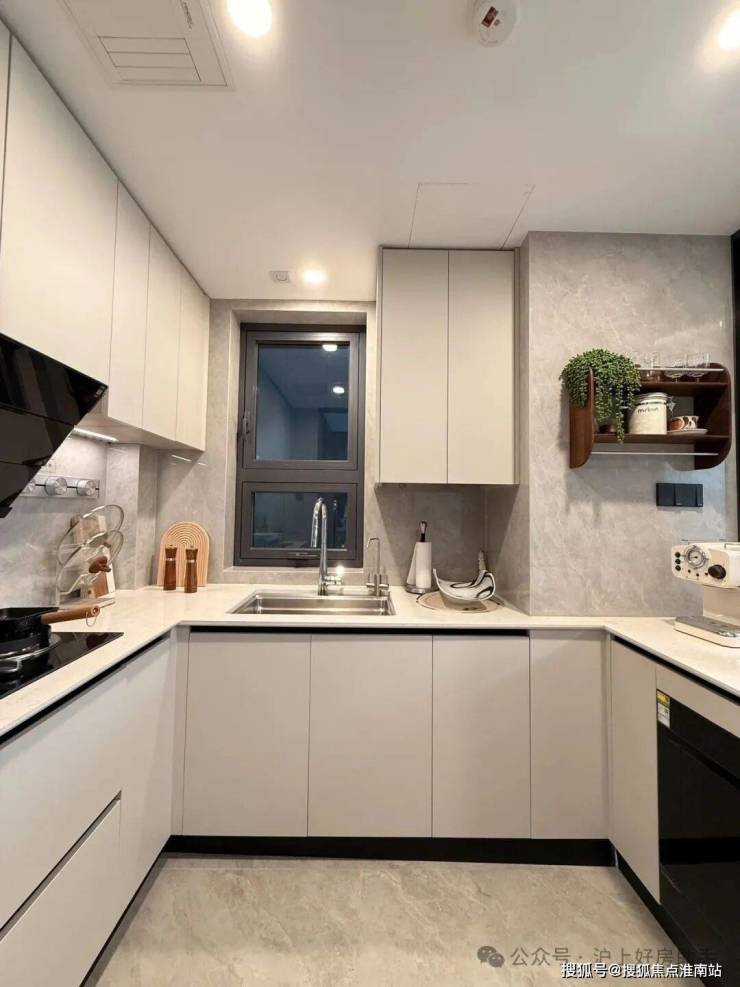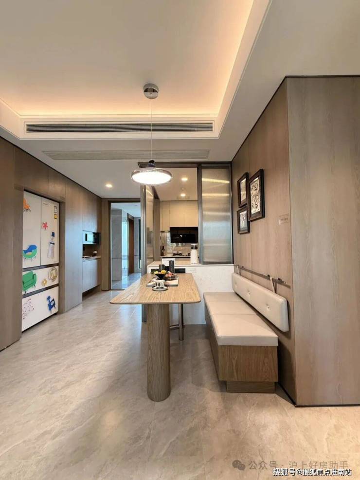 LDKB一体化设计。通过金属玻璃移门和岛台联动,达成餐厨一体,增加家庭成员互动。烟道外置以及S墙内嵌设计,优化空间布局,提升台面使用感和转角柜使用频率。