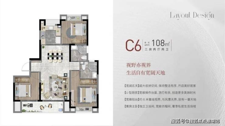 建面约108㎡3房2厅2卫,做到了三开间朝南+双阳台设计+主卧套房设计+南北通透,该户型得房率非常高。