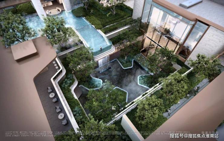 飞瀑之上,是一座无边悬浮戏水池,可直接俯瞰下沉式景观庭院,身处其中仿佛与自然融为一体。