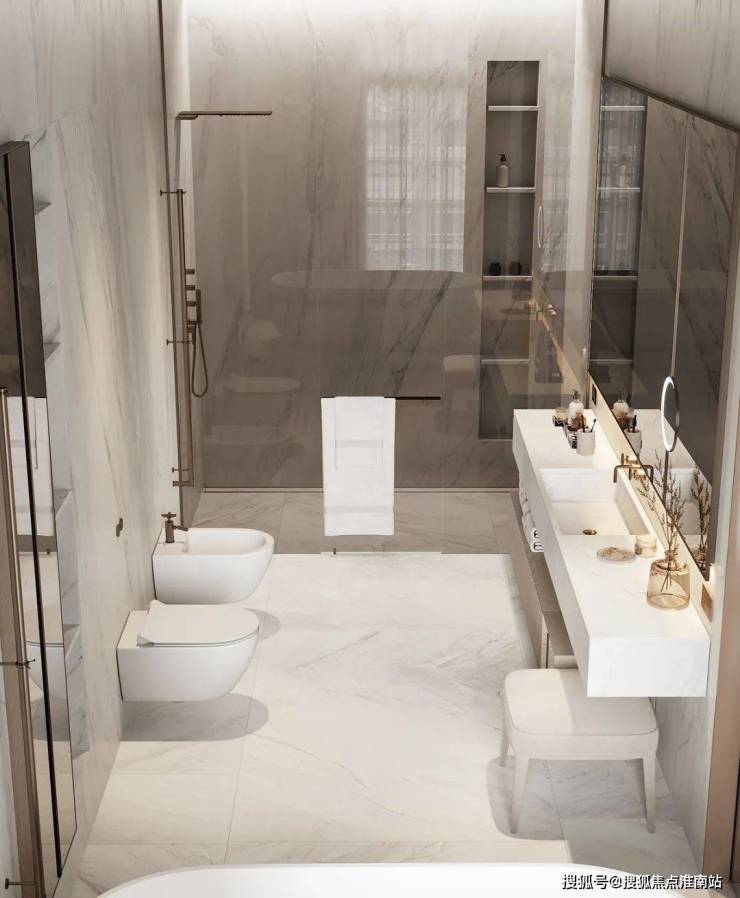 卫生间通过明亮的光线来表现空间的洁净,白色的大理石把空间衬托的干净纯粹,更显高级感。