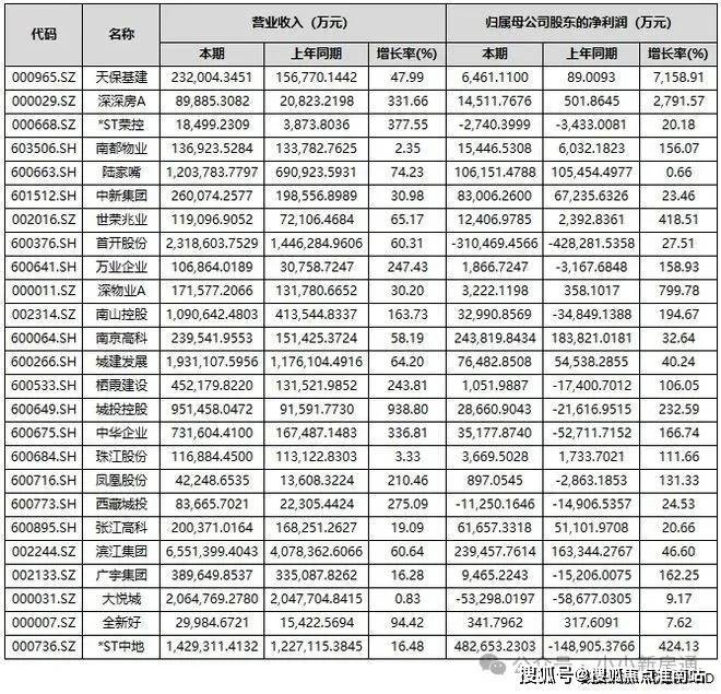 有37家房企实现归母净利润实现同比正增长。其中,天保基建、深深房A、深物业A、渝开发、*ST中地、世荣兆业、城投控股、南山控股、中华企业、广宇集团、万业企业、南都物业、新黄浦、凤凰股份、中洲控股、珠江股份、栖霞建设17家房企前三季度的归母净利润增长超过100%。