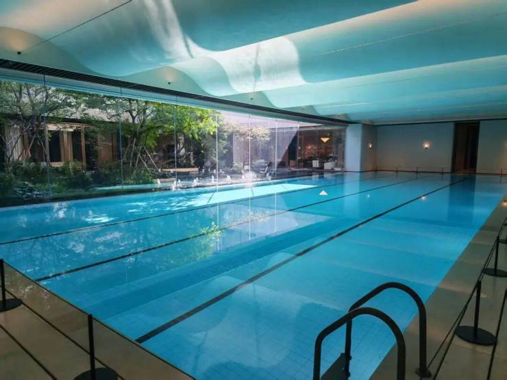 最后来看泳池。云邸玖章做了再升级。改为采用大尺度的落地玻璃拼接,约2.4米宽巨幅玻璃,且通过精致的玻璃交接细节处理增进室内外空间的融合,强调泳池的无界感,真正实现了无边泳池的效果、质的飞跃。