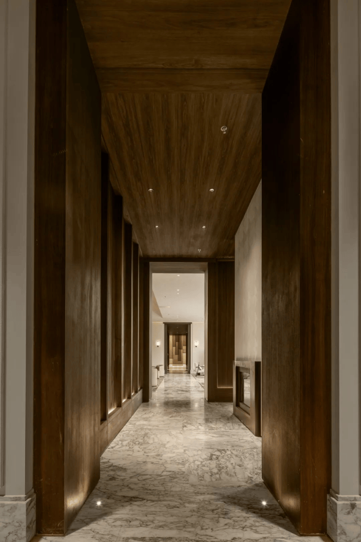 进入大堂,抬眼可见的是由一块完整的巨型玻璃组成的天窗,约7.9米高的钻石切面整玻吊顶+约500余块大花白奢石铺就的地面,让人每一次走进来都能感受到自然光线的包围,仪式感十足!