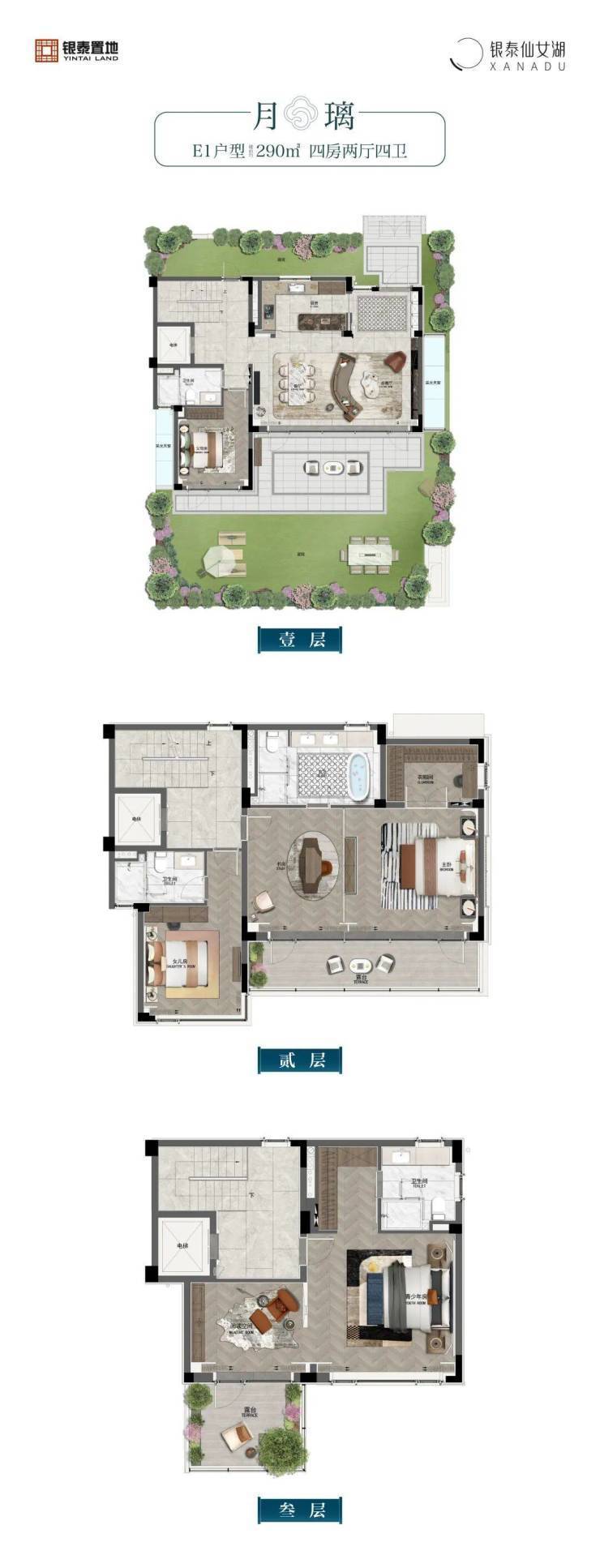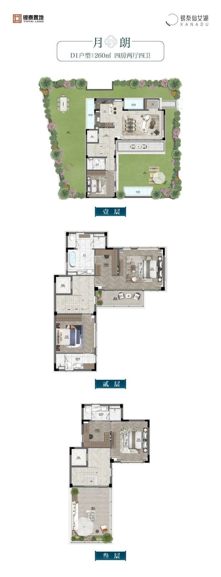 地上三层(一层3.4米、二层3米、三层2.9米+坡屋顶),地下一层(层高3.2米-6.8米)独门独户,拥有无数人垂涎的前庭、后院生活,将仙女湖畔的深林与小径美景延伸到园里来,开启庄园般的自在奢享。