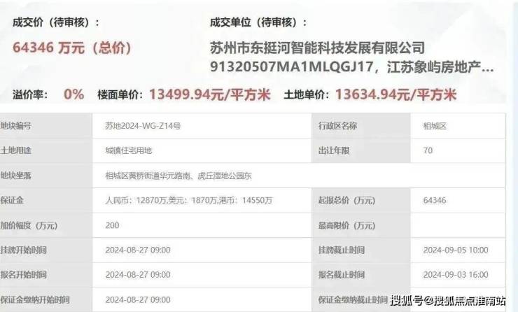 2024年9月5日,苏地2024-WG-Z14号地块成功出让,楼面价约13500元/平方米,地块容积率1.01,出让要求地块住宅户型面积不小于140平方米。