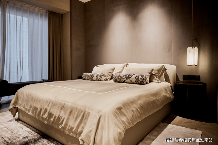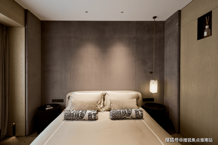 主卧背景墙则采用深灰色面料,配以木饰面,呈现低调奢华的高级感。